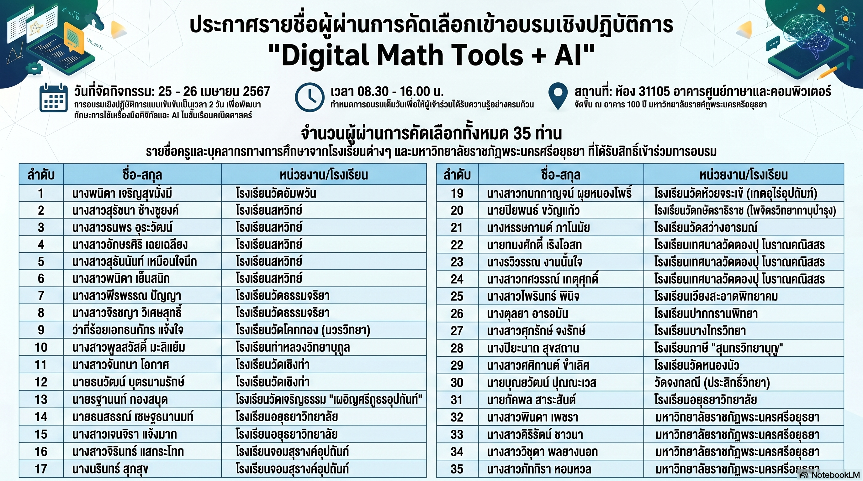 ประกาศรายชื่อผู้ผ่านการคัดเลือกเข้ารับการอบรมโครงการ "วิจัยเพื่อยกระดับการศึกษาวิทยาศาสตร์ คณิตศาสตร์และเทคโนโลยี จังหวัดพระนครศรีอยุธยา มหาวิทยาลัยราชภัฏพระนครศรีอยุธยา ร่วมกับ สสวท. ปีงบประมาณ 2568