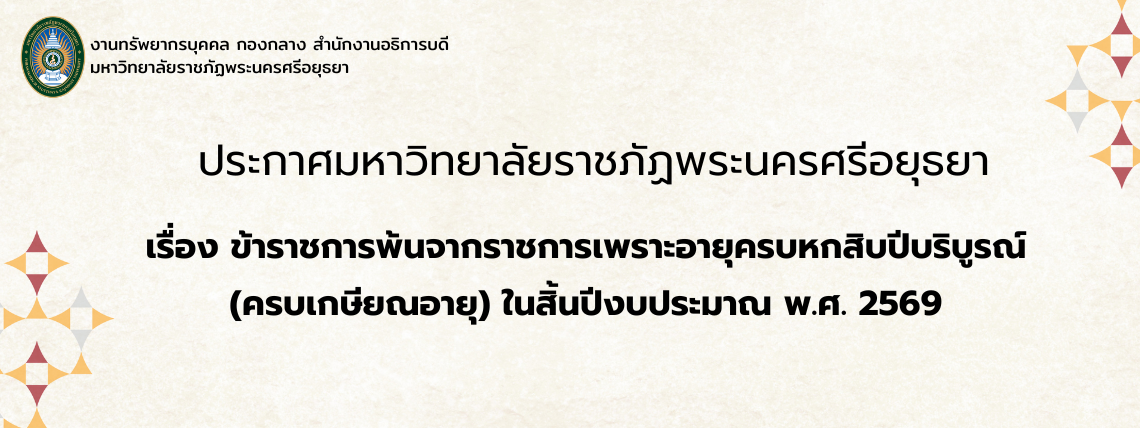 ประกาศมหาวิทยาลัยราชภัฏพระนครศรีอยุธยา เรื่อง รายชื่อผู้มีสิทธิ์เข้ารับการสอบแข่งขันภาคความรู้ความสามารถเฉพาะตำแหน่งและภาคความเหมาะสมกับตำแหน่ง เพื่อบรรจุและแต่งตั้งเป็นพนักงานมหาวิทยาลัย ตำแหน่งประเภทวิชาการ ครั้งที่ 26/2568 (สังกัดคณะมนุษยศาสตร์และสังคมศาสตร์)