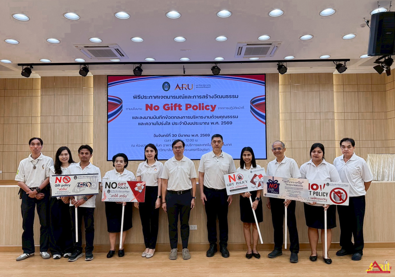 อาจารย์ ดร.กันยาลักษณ์ โพธิ์ดง ผู้อำนวยการสำนักวิทยบริการและเทคโนโลยีสารสนเทศ พร้อมด้วยบุคลากร เข้าร่วมกิจกรรมประกาศเจตนารมณ์การดำเนินงานตามนโยบาย No Gift Policy เพื่อส่งเสริมการปฏิบัติหน้าที่อย่างโปร่งใส เป็นธรรม และยึดมั่นในหลักคุณธรรม