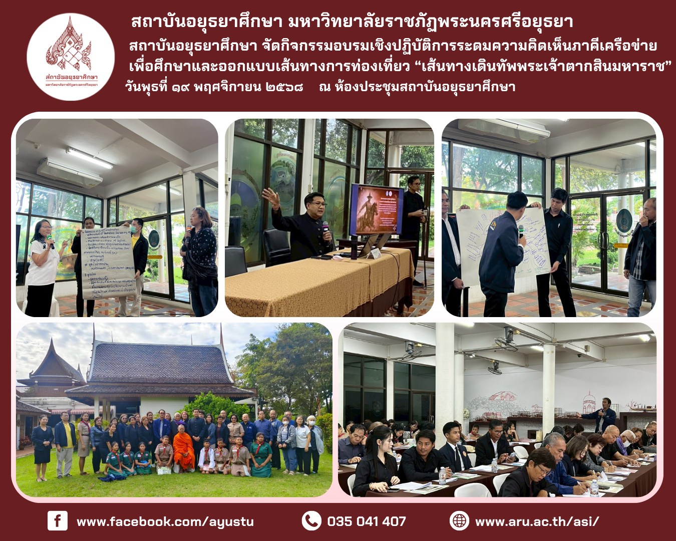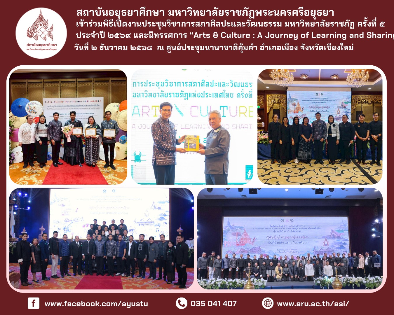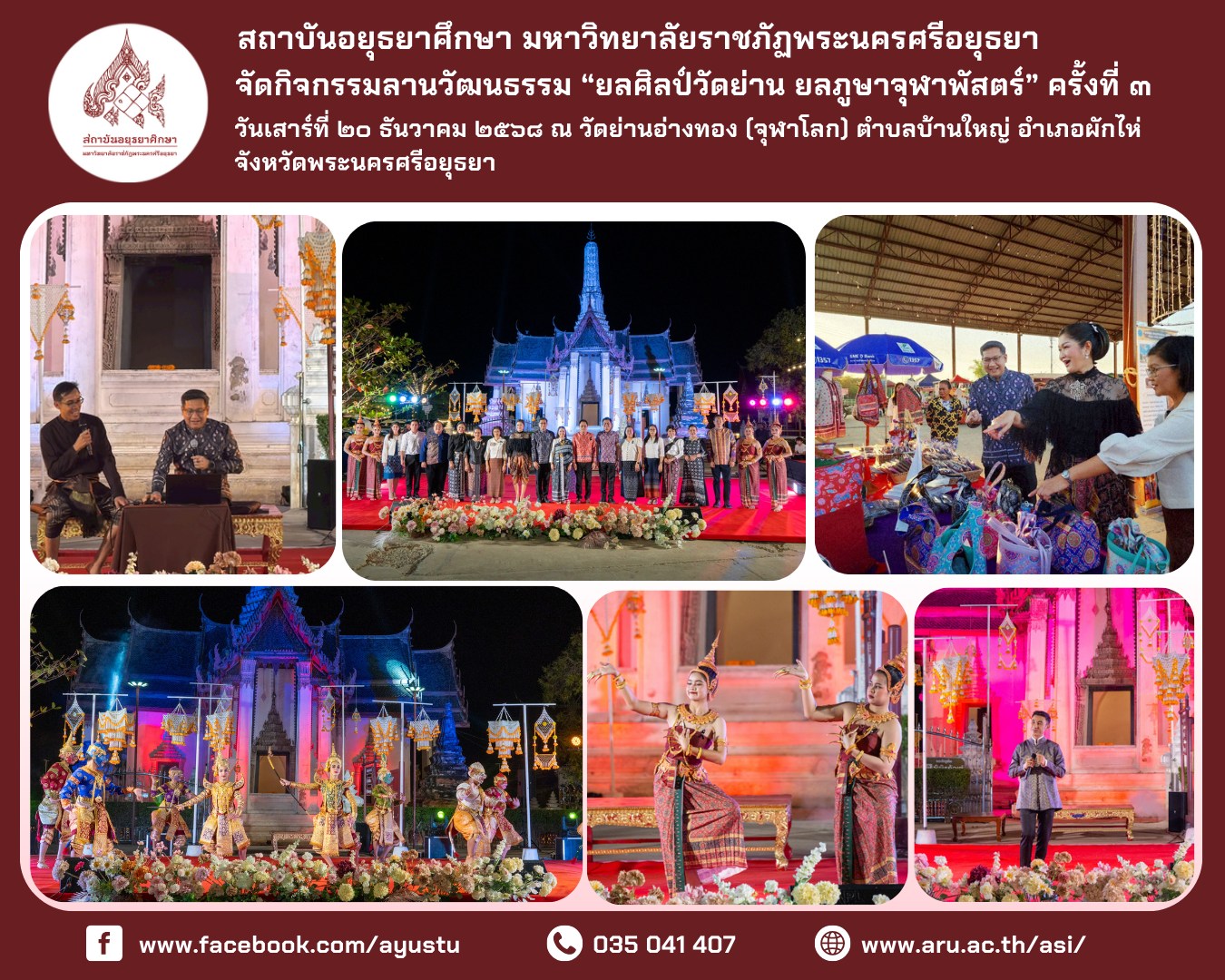 • ระหว่างวันที่ ๒๖–๒๘ ธันวาคม ๒๕๖๘ สถาบันอยุธยาศึกษา มหาวิทยาลัยราชภัฏพระนครศรีอยุธยา นำโดย อาจารย์ ดร.สุรินทร์ ศรีสังข์งาม ผู้อำนวยการ พร้อมด้วยบุคลากร เข้าร่วมจัดแสดงนิทรรศการและแลกเปลี่ยนองค์ความรู้ด้านผ้าโบราณและภูมิปัญญาท้องถิ่น ณ พิพิธภัณฑ์ผ้าโบราณชัยภูมิ “เฮือนคำมุ” อำเภอเมืองชัยภูมิ จังหวัดชัยภูมิ การเข้าร่วมกิจกรรมในครั้งนี้ มีวัตถุประสงค์เพื่อเผยแพร่องค์ความรู้และผลงานด้านการส่งเสริมและพัฒนา “ผ้าลายอย่างจุฬาพัสตร์” ของชุมชนวัดย่านอ่างทอง (จุฬาโลก) อำเภอผักไห่ จังหวัดพระนครศรีอยุธยา ซึ่งเป็นมรดกทางวัฒนธรรมที่สถาบันอยุธยาศึกษาได้ศึกษา ค้นคว้า และพัฒนาอย่างต่อเนื่องจนเป็นที่ยอมรับในระดับประเทศ พร้อมทั้งเปิดพื้นที่แห่งการเรียนรู้ร่วมกันระหว่างนักวิชาการ ชุมชน และแหล่งเรียนรู้ด้านผ้าโบราณของจังหวัดชัยภูมิ ภายในกิจกรรมประกอบด้วยการจัดแสดงนิทรรศการ การนำเสนอผลงาน การให้ข้อมูลแก่ผู้เข้าชม ตลอดจนการแลกเปลี่ยนประสบการณ์ด้านผ้าโบราณ ภูมิปัญญาท้องถิ่น ศิลปะ และวัฒนธรรม รวมถึงการเยี่ยมชมพิพิธภัณฑ์ผ้าโบราณชัยภูมิ “เฮือนคำมุ” ซึ่งจัดแสดงผ้าทอโบราณมากกว่า ๓๐๐ ลวดลาย มีอายุระหว่างประมาณ ๕๐–๓๐๐ ปี ควบคู่กับโซนจัดแสดงประวัติศาสตร์และโบราณวัตถุ ตั้งแต่ยุคก่อนประวัติศาสตร์จนถึงยุคประวัติศาสตร์ การเข้าร่วมจัดนิทรรศการในครั้งนี้ นับเป็นอีกก้าวสำคัญของสถาบันอยุธยาศึกษาในการเชื่อมโยงองค์ความรู้จากกรุงเก่าสู่ภูมิภาค เสริมสร้างเครือข่ายความร่วมมือทางวิชาการด้านศิลปวัฒนธรรม และนำองค์ความรู้ที่ได้รับไปประยุกต์ใช้ในการพัฒนากระบวนการส่งเสริมการเรียนรู้ด้านภูมิปัญญาท้องถิ่นอย่างยั่งยืน สถาบันอยุธยาศึกษา มหาวิทยาลัยราชภัฏพระนครศรีอยุธยา ขอขอบคุณ อาจารย์ ดร.คมกฤช ฤทธิ์ขจร ผู้อำนวยการพิพิธภัณฑ์ผ้าโบราณชัยภูมิ จังหวัดชัยภูมิ ที่ให้ความอนุเคราะห์ อำนวยความสะดวก และถ่ายทอดองค์ความรู้ด้านผ้าโบราณและมรดกทางวัฒนธรรมเป็นอย่างดียิ่ง
