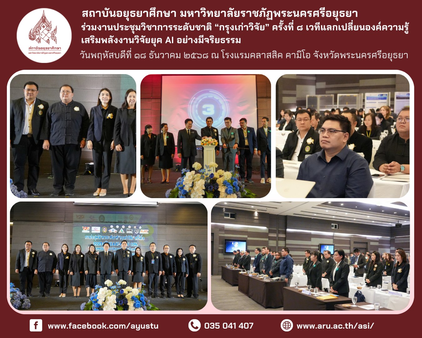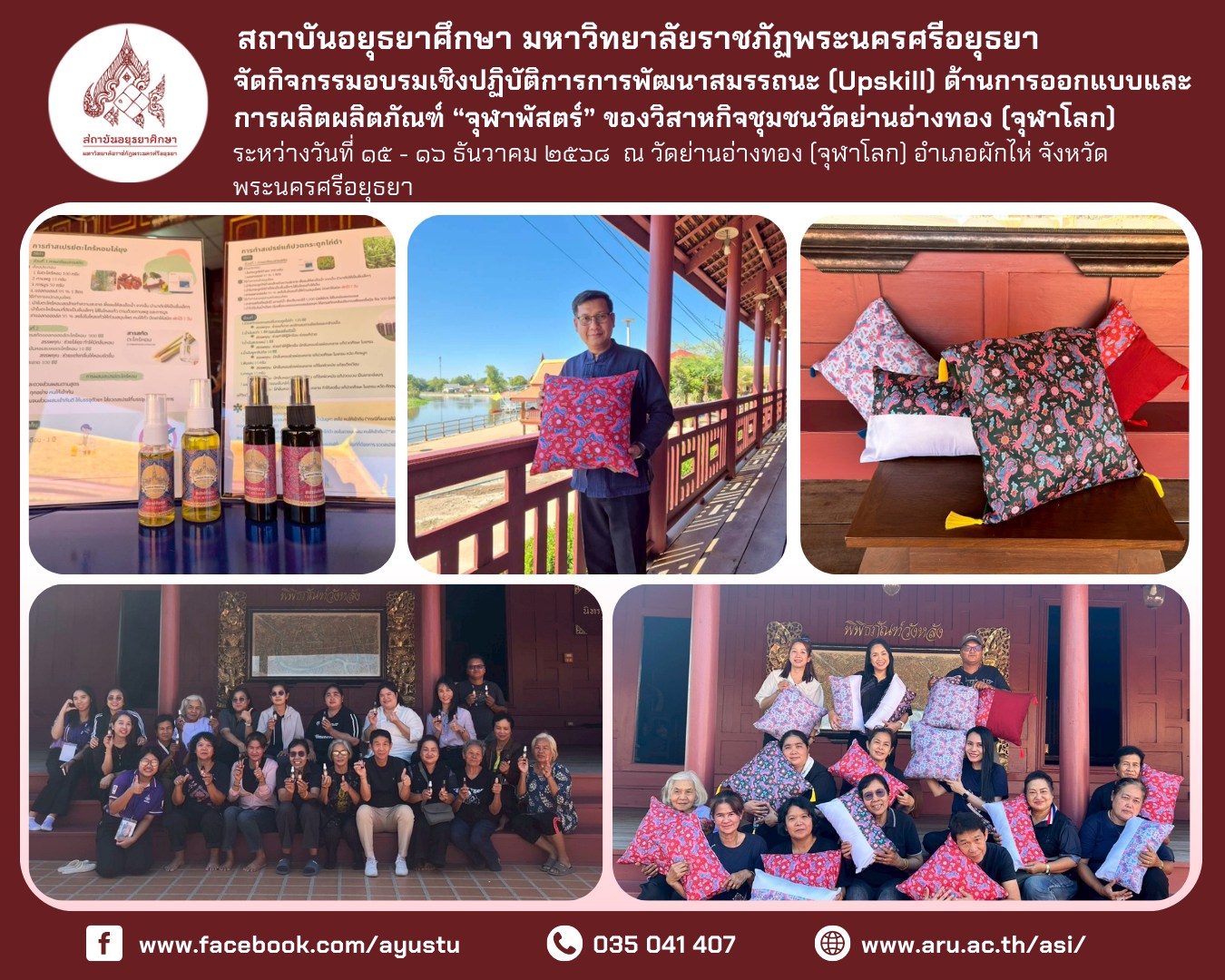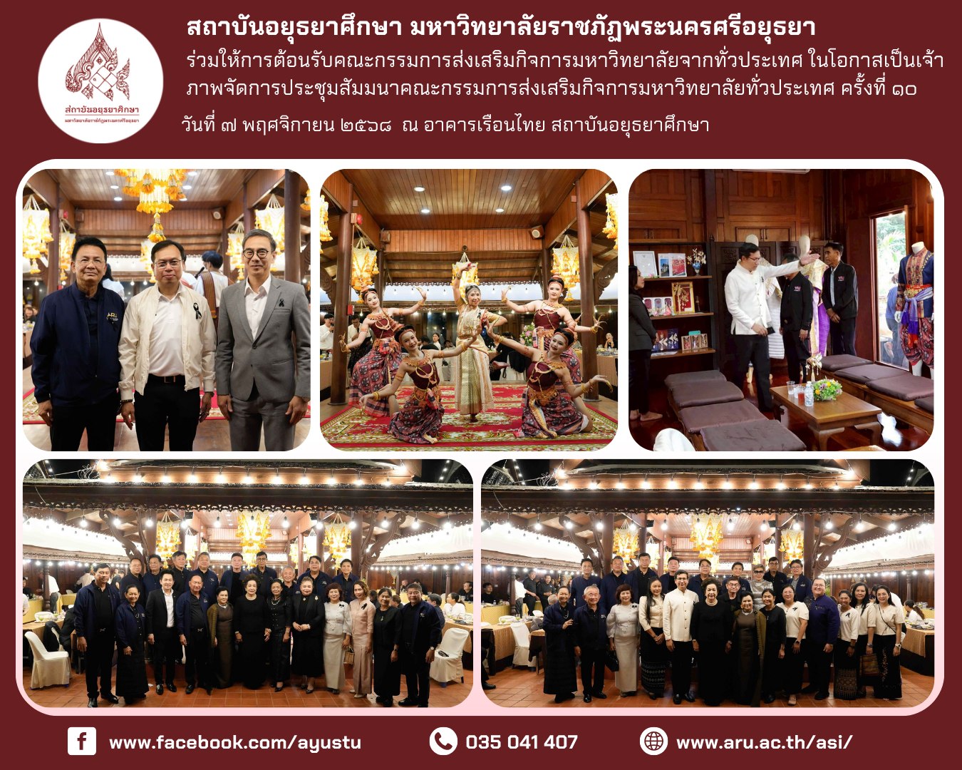 • ระหว่างวันที่ ๒๖–๒๘ ธันวาคม ๒๕๖๘ สถาบันอยุธยาศึกษา มหาวิทยาลัยราชภัฏพระนครศรีอยุธยา นำโดย อาจารย์ ดร.สุรินทร์ ศรีสังข์งาม ผู้อำนวยการ พร้อมด้วยบุคลากร เข้าร่วมจัดแสดงนิทรรศการและแลกเปลี่ยนองค์ความรู้ด้านผ้าโบราณและภูมิปัญญาท้องถิ่น ณ พิพิธภัณฑ์ผ้าโบราณชัยภูมิ “เฮือนคำมุ” อำเภอเมืองชัยภูมิ จังหวัดชัยภูมิ การเข้าร่วมกิจกรรมในครั้งนี้ มีวัตถุประสงค์เพื่อเผยแพร่องค์ความรู้และผลงานด้านการส่งเสริมและพัฒนา “ผ้าลายอย่างจุฬาพัสตร์” ของชุมชนวัดย่านอ่างทอง (จุฬาโลก) อำเภอผักไห่ จังหวัดพระนครศรีอยุธยา ซึ่งเป็นมรดกทางวัฒนธรรมที่สถาบันอยุธยาศึกษาได้ศึกษา ค้นคว้า และพัฒนาอย่างต่อเนื่องจนเป็นที่ยอมรับในระดับประเทศ พร้อมทั้งเปิดพื้นที่แห่งการเรียนรู้ร่วมกันระหว่างนักวิชาการ ชุมชน และแหล่งเรียนรู้ด้านผ้าโบราณของจังหวัดชัยภูมิ ภายในกิจกรรมประกอบด้วยการจัดแสดงนิทรรศการ การนำเสนอผลงาน การให้ข้อมูลแก่ผู้เข้าชม ตลอดจนการแลกเปลี่ยนประสบการณ์ด้านผ้าโบราณ ภูมิปัญญาท้องถิ่น ศิลปะ และวัฒนธรรม รวมถึงการเยี่ยมชมพิพิธภัณฑ์ผ้าโบราณชัยภูมิ “เฮือนคำมุ” ซึ่งจัดแสดงผ้าทอโบราณมากกว่า ๓๐๐ ลวดลาย มีอายุระหว่างประมาณ ๕๐–๓๐๐ ปี ควบคู่กับโซนจัดแสดงประวัติศาสตร์และโบราณวัตถุ ตั้งแต่ยุคก่อนประวัติศาสตร์จนถึงยุคประวัติศาสตร์ การเข้าร่วมจัดนิทรรศการในครั้งนี้ นับเป็นอีกก้าวสำคัญของสถาบันอยุธยาศึกษาในการเชื่อมโยงองค์ความรู้จากกรุงเก่าสู่ภูมิภาค เสริมสร้างเครือข่ายความร่วมมือทางวิชาการด้านศิลปวัฒนธรรม และนำองค์ความรู้ที่ได้รับไปประยุกต์ใช้ในการพัฒนากระบวนการส่งเสริมการเรียนรู้ด้านภูมิปัญญาท้องถิ่นอย่างยั่งยืน สถาบันอยุธยาศึกษา มหาวิทยาลัยราชภัฏพระนครศรีอยุธยา ขอขอบคุณ อาจารย์ ดร.คมกฤช ฤทธิ์ขจร ผู้อำนวยการพิพิธภัณฑ์ผ้าโบราณชัยภูมิ จังหวัดชัยภูมิ ที่ให้ความอนุเคราะห์ อำนวยความสะดวก และถ่ายทอดองค์ความรู้ด้านผ้าโบราณและมรดกทางวัฒนธรรมเป็นอย่างดียิ่ง