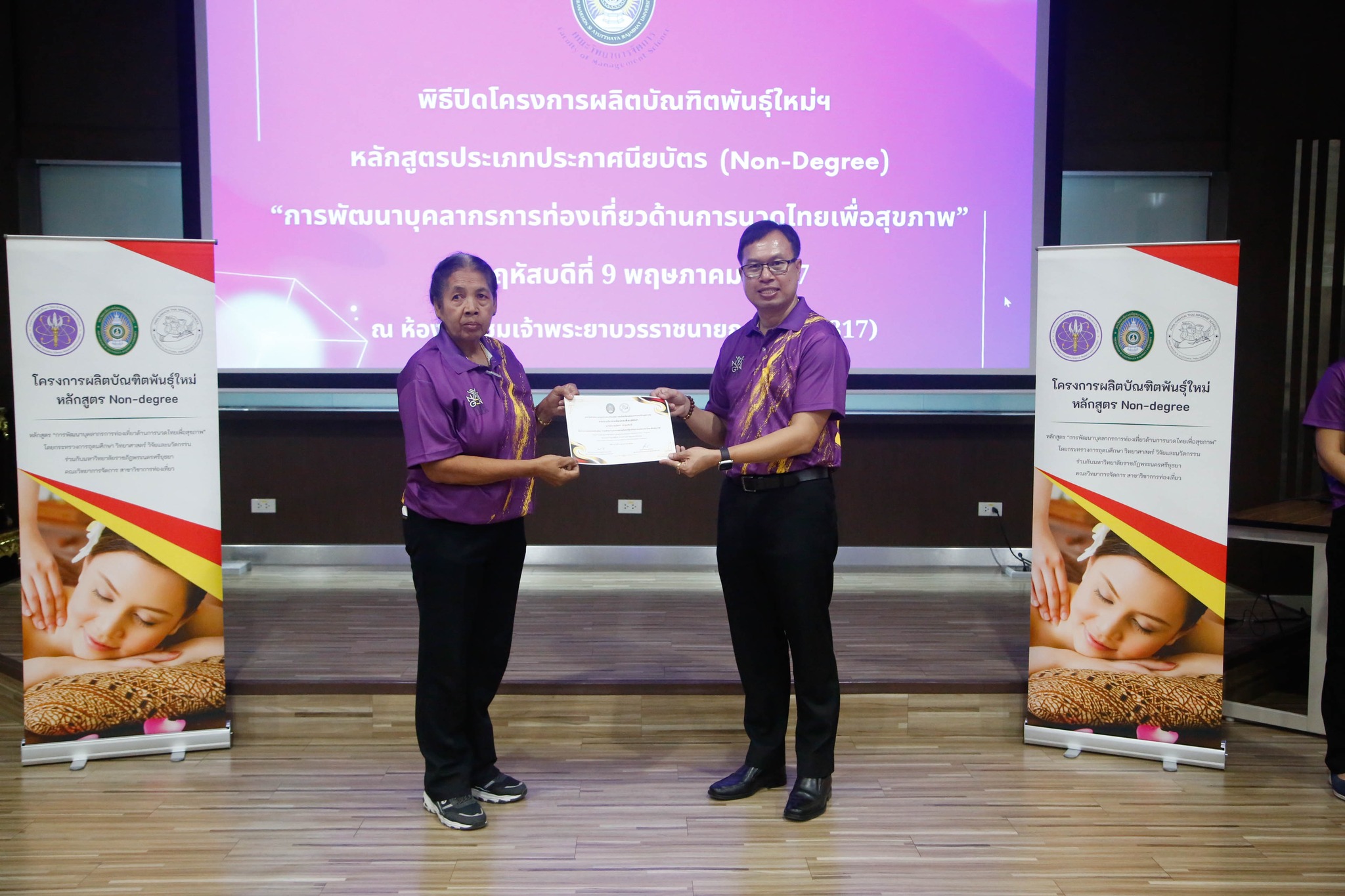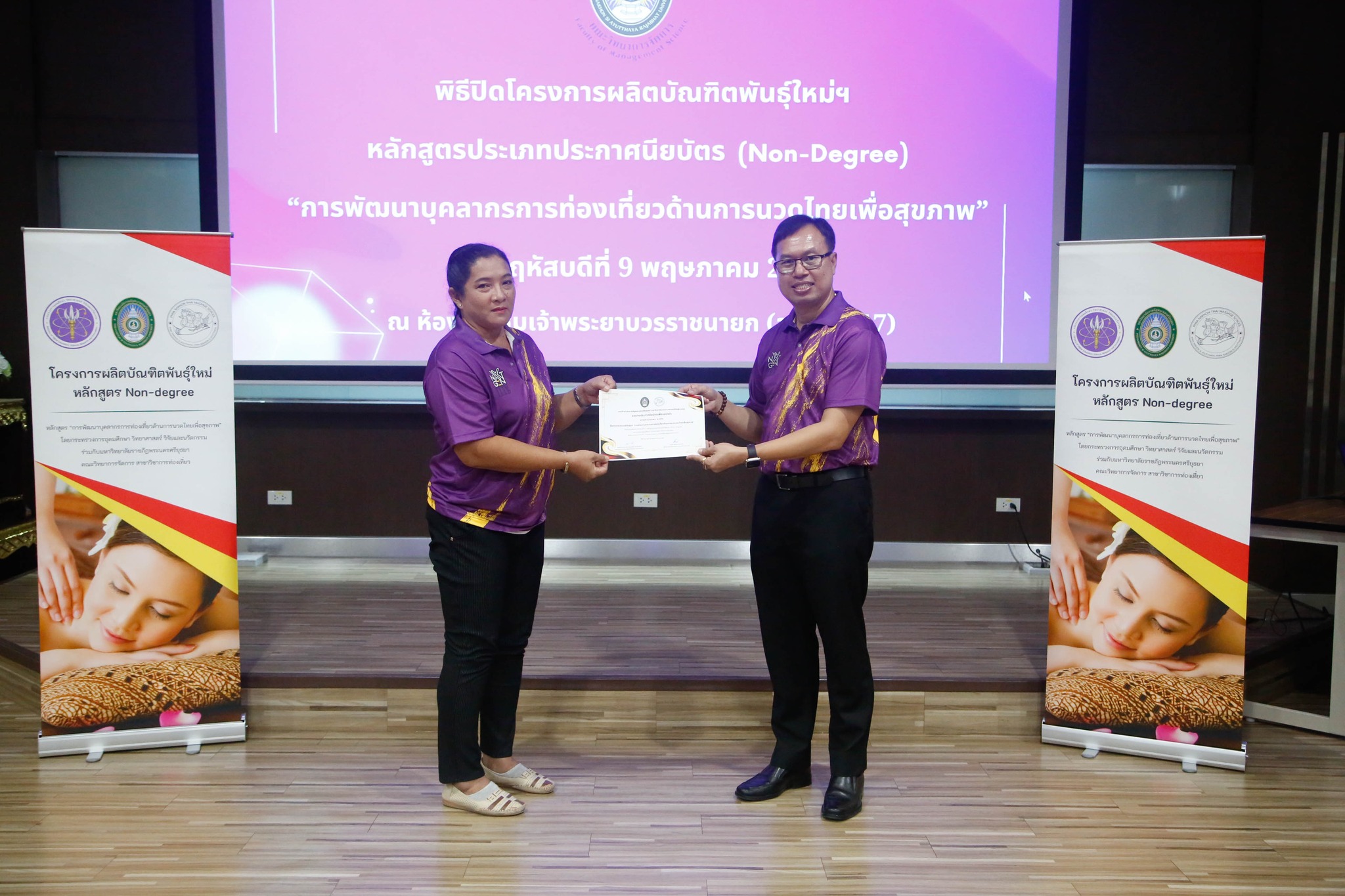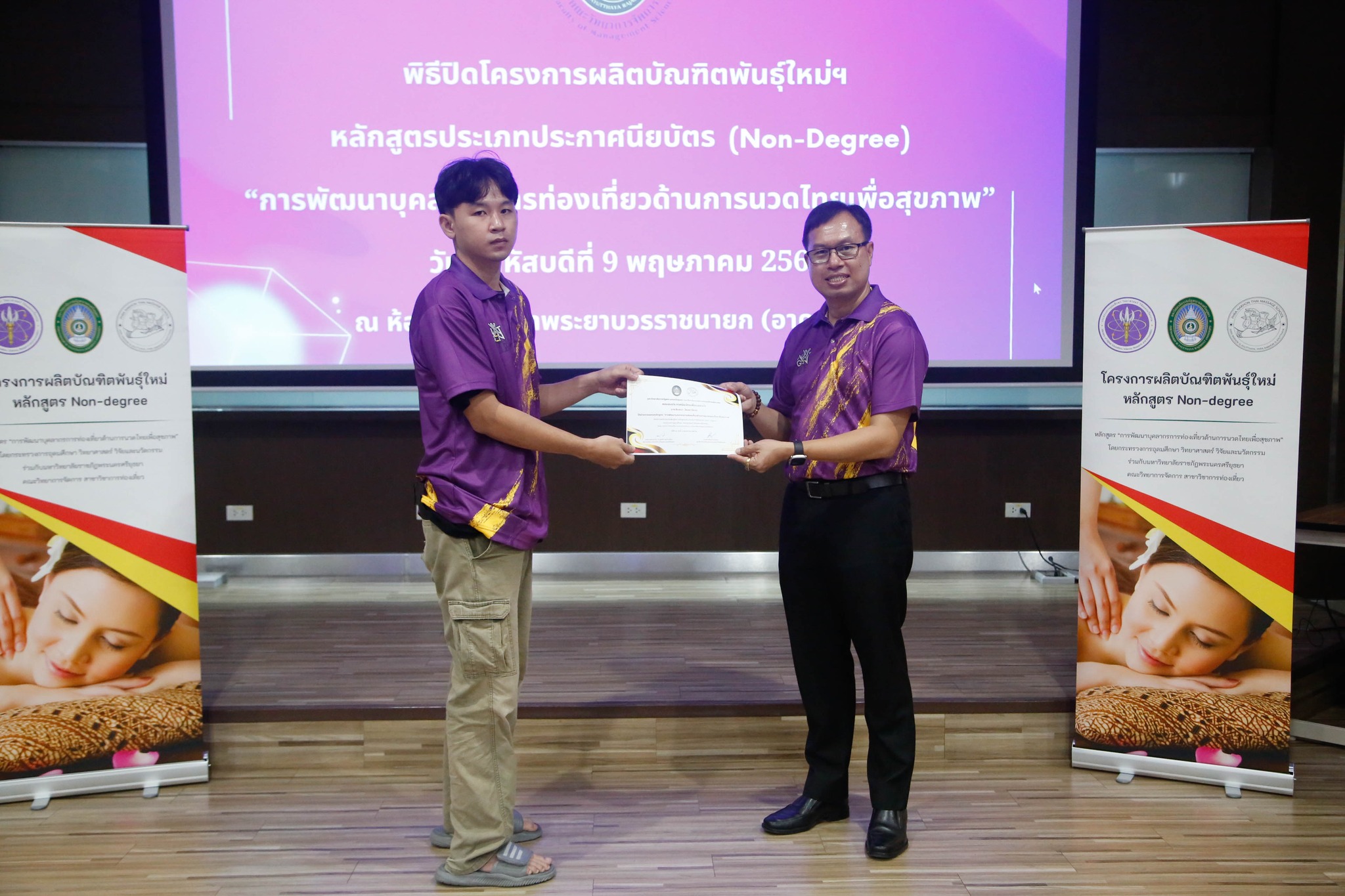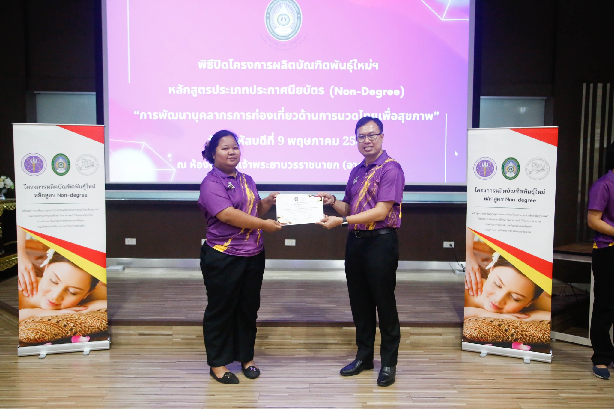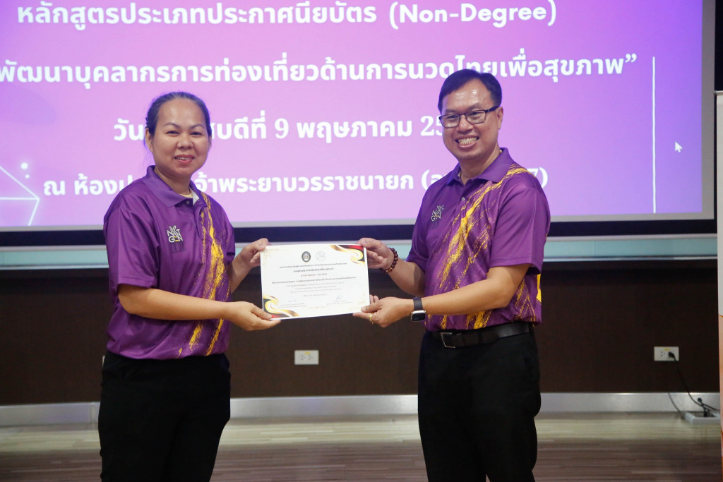 มอบใบประกาศนียบัตรโครงการผลิตบัณฑิตพันธุ์ใหม่ “หลักสูตรการพัฒนาบุคลากรการท่องเที่ยวด้านการนวดไทยเพื่อสุขภาพ” โดยสาขาวิชาการท่องเที่ยว