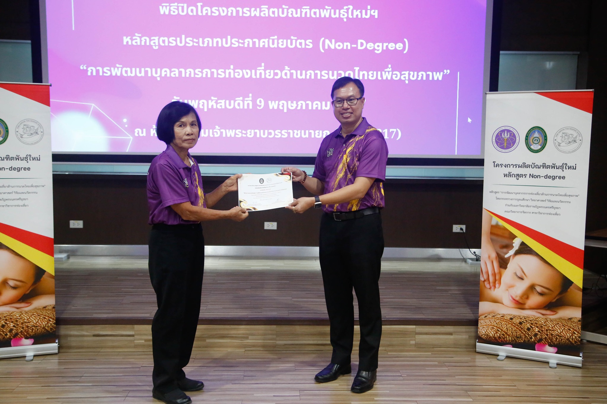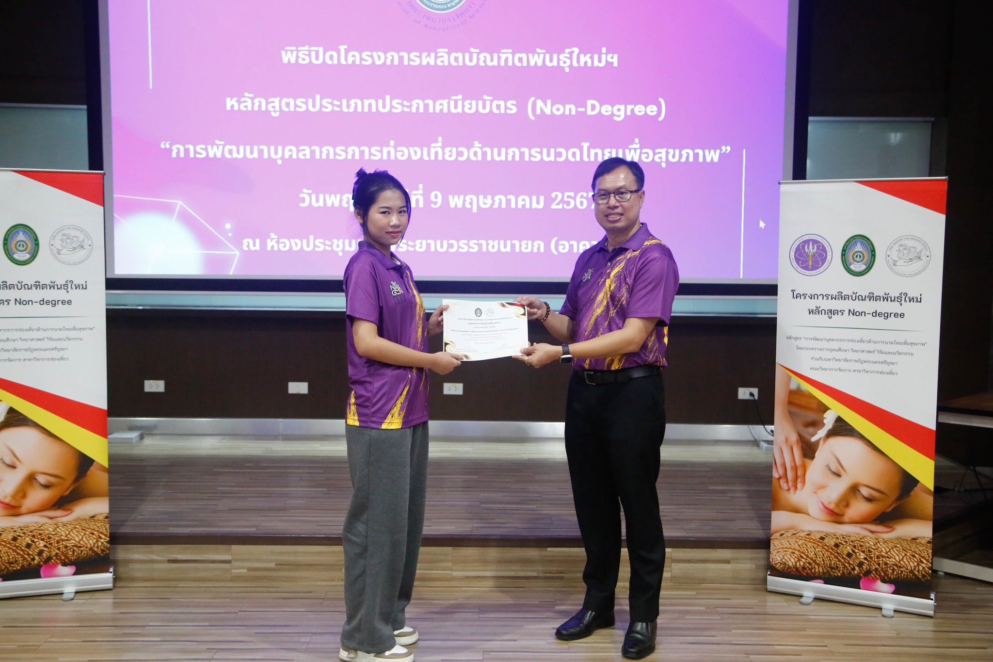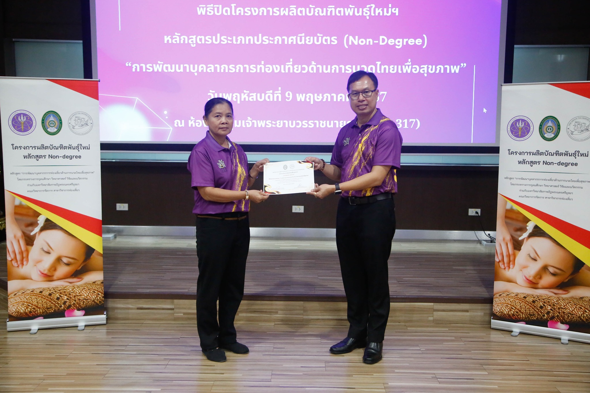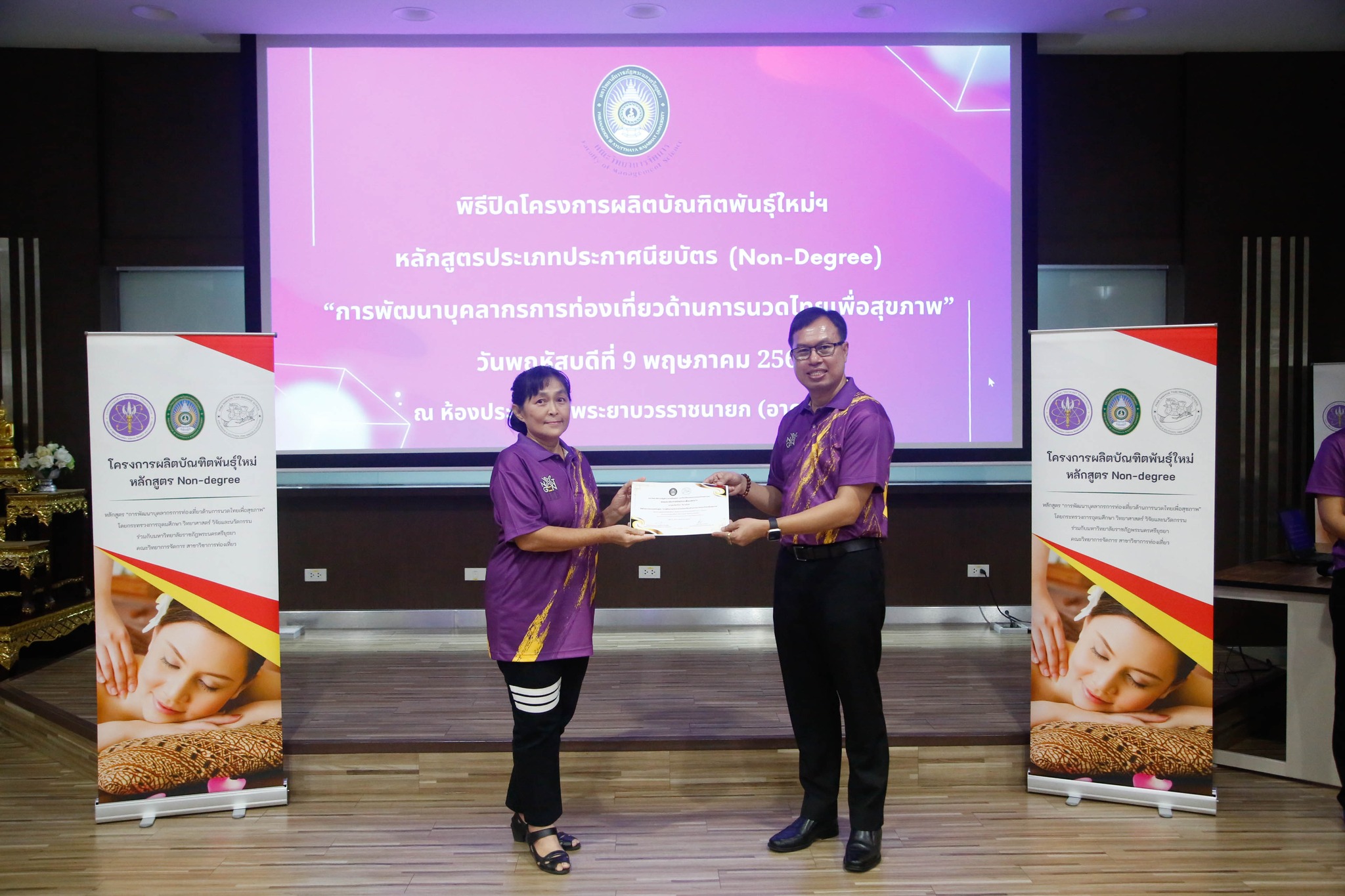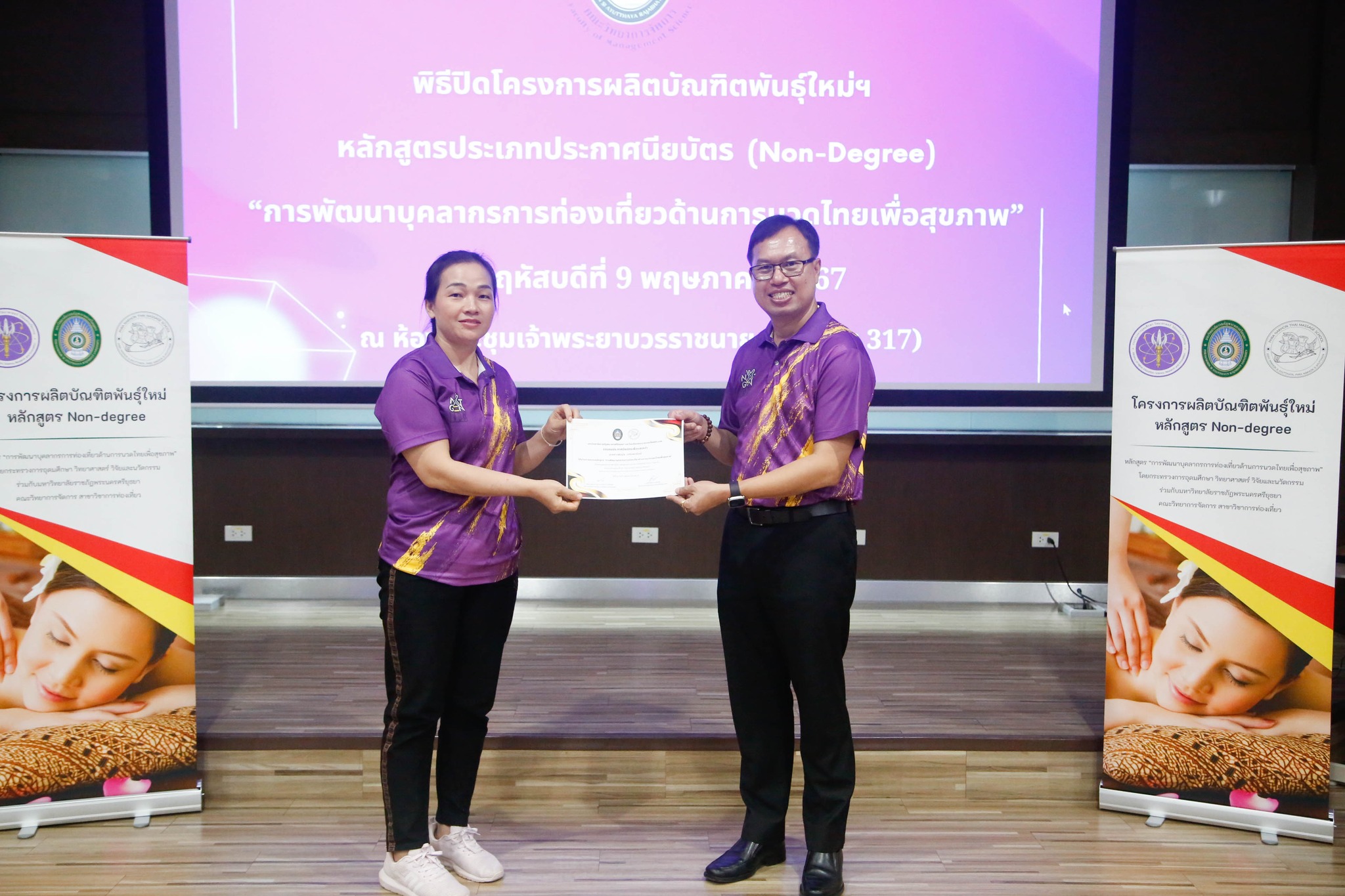 มอบใบประกาศนียบัตรโครงการผลิตบัณฑิตพันธุ์ใหม่ “หลักสูตรการพัฒนาบุคลากรการท่องเที่ยวด้านการนวดไทยเพื่อสุขภาพ” โดยสาขาวิชาการท่องเที่ยว