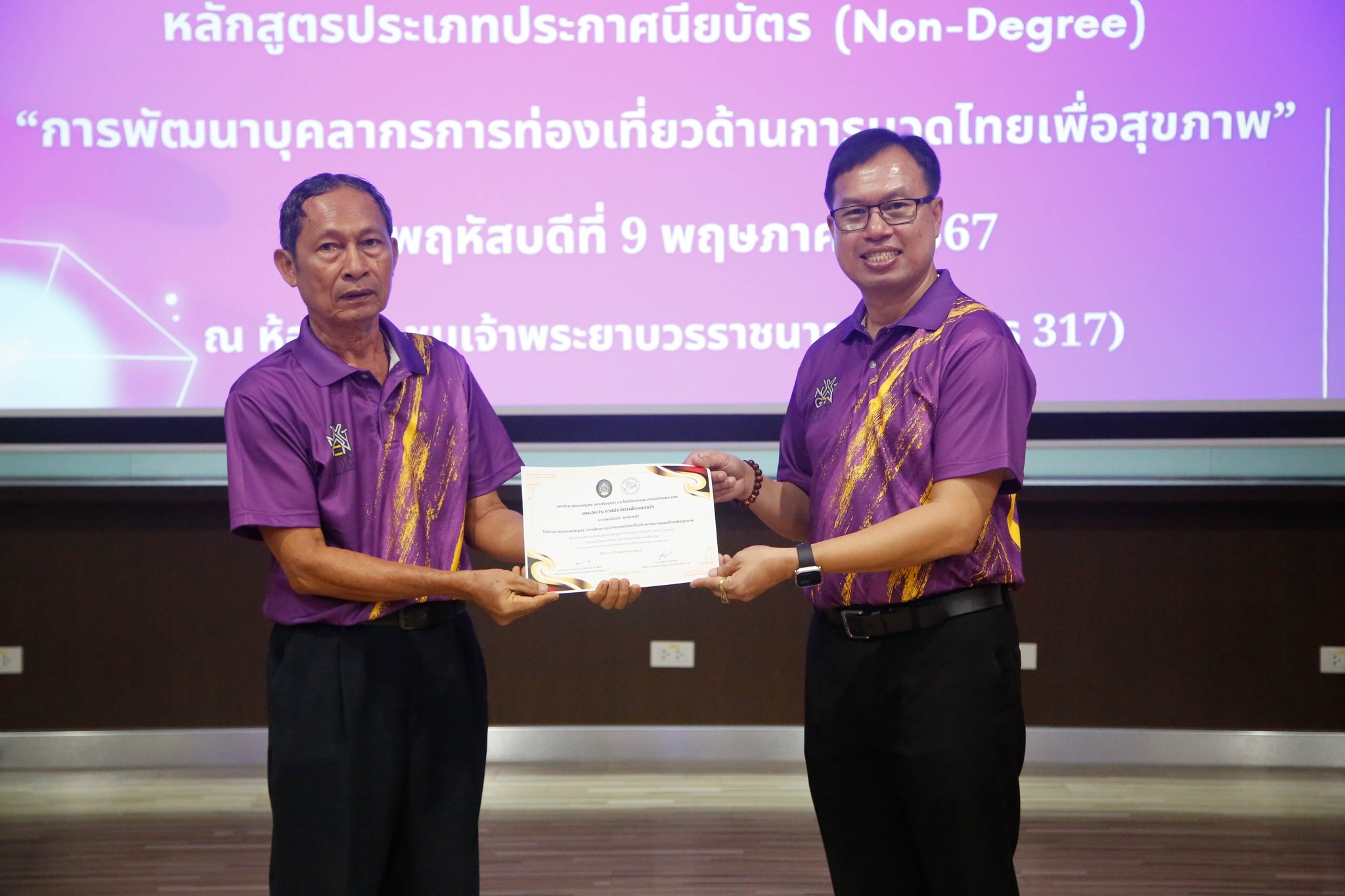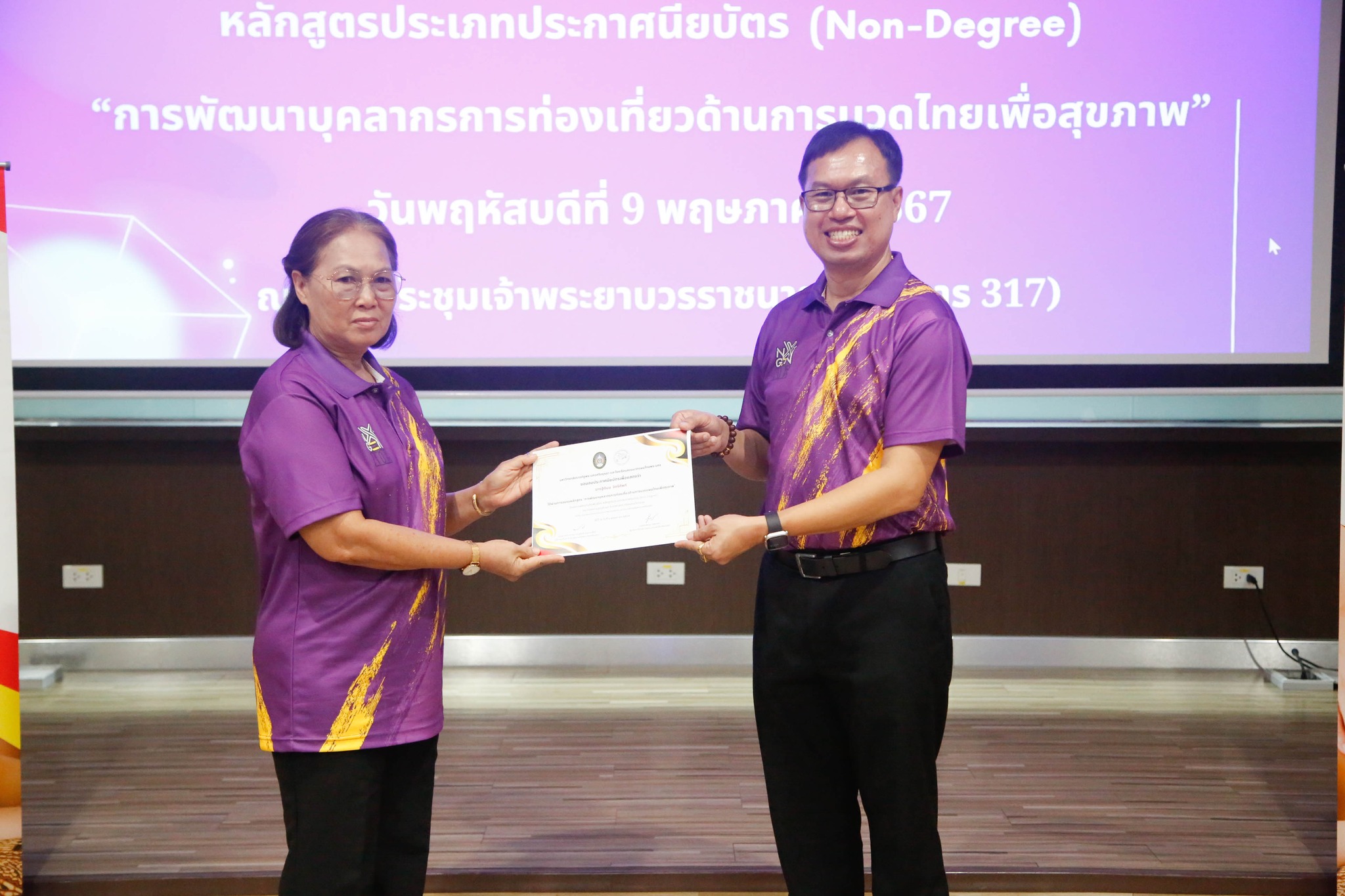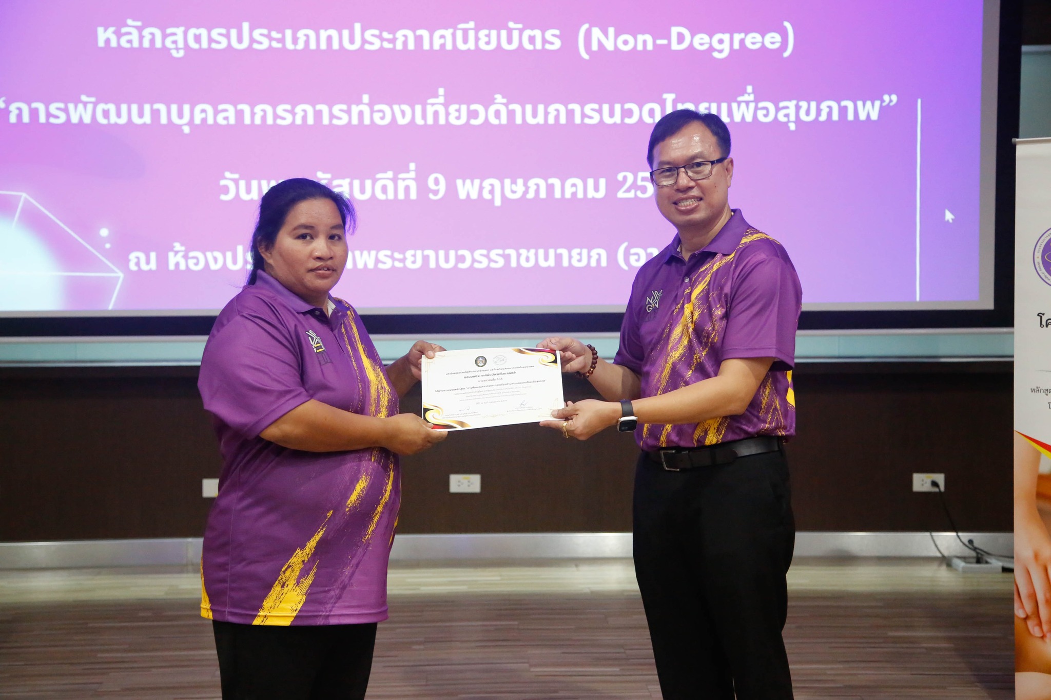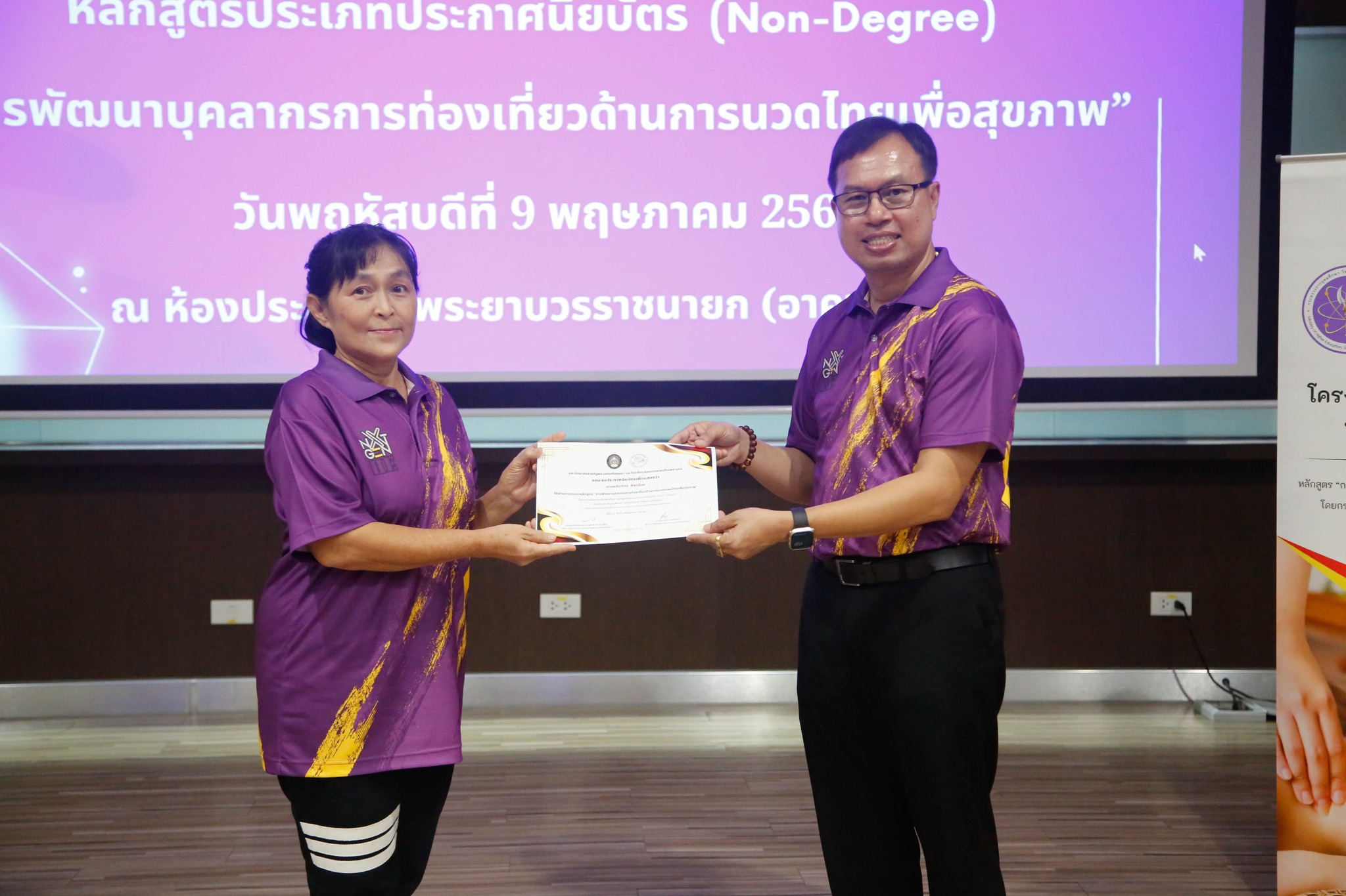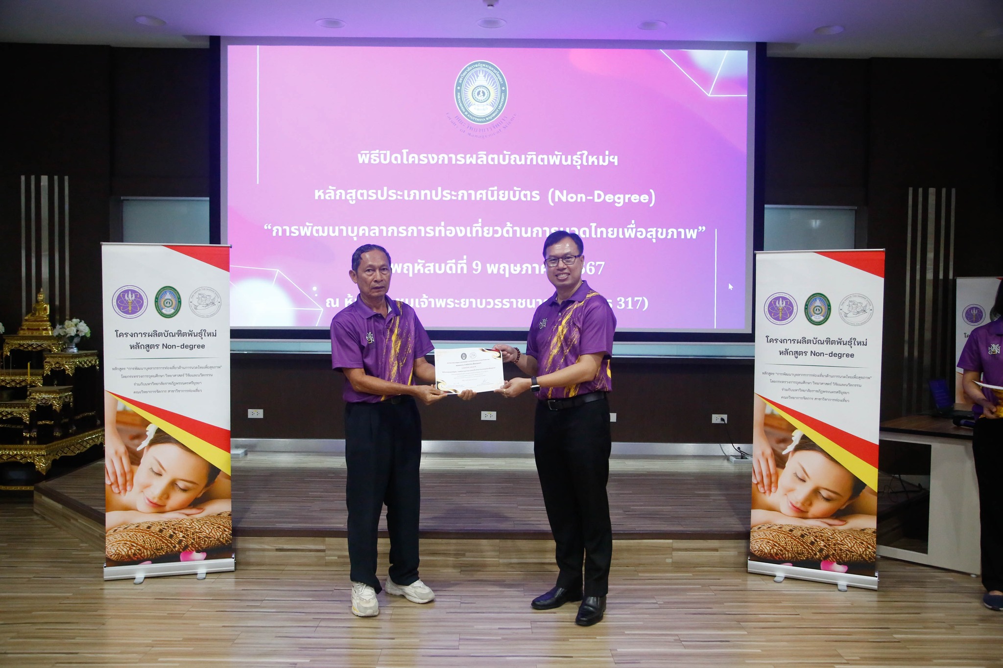 มอบใบประกาศนียบัตรโครงการผลิตบัณฑิตพันธุ์ใหม่ “หลักสูตรการพัฒนาบุคลากรการท่องเที่ยวด้านการนวดไทยเพื่อสุขภาพ” โดยสาขาวิชาการท่องเที่ยว