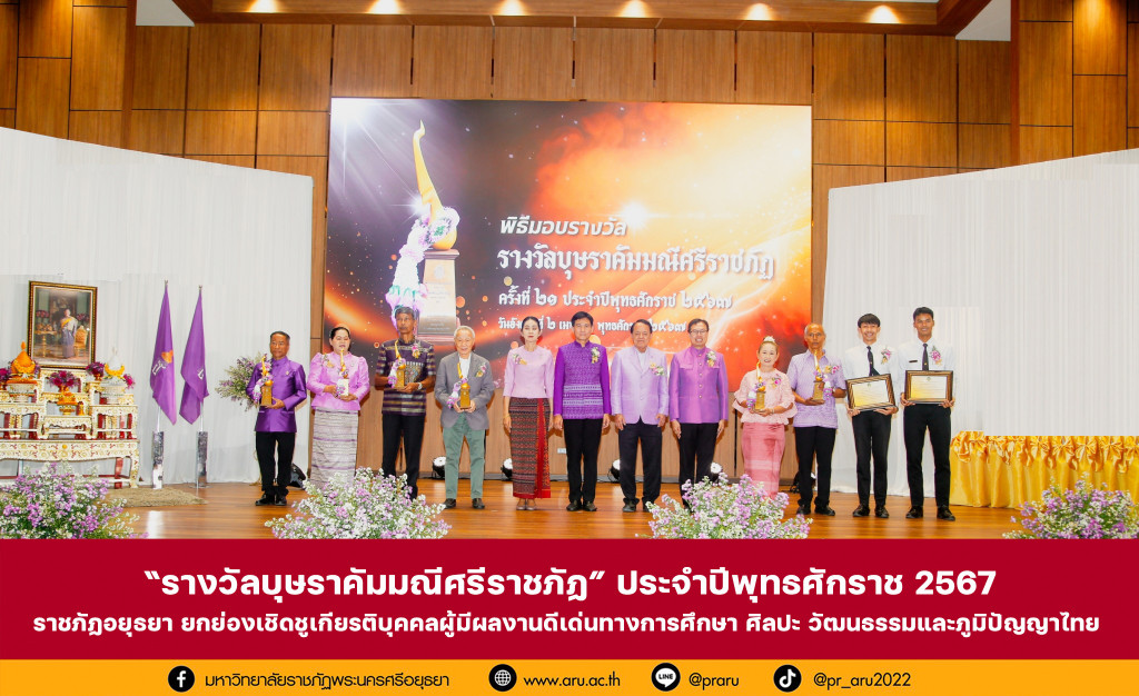 ราชภัฏอยุธยา ยกย่องเชิดชูเกียรติบุคคลผู้มีผลงานดีเด่นทางการศึกษา ศิลปะ วัฒนธรรมและภูมิปัญญาไทย “บุษราคัมมณีศรีราชภัฏ” ประจำปีพุทธศักราช 2567