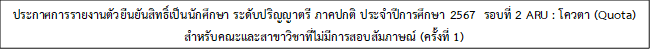 การชำระเงินค่ายืนยันสิทธิ์การเป็นนักศึกษาเป็นนักศึกษา ภาคปกติ ระดับปริญญาตรี ประจำปีการศึกษา 2567 รอบที่ 2 ARU : โควตา (Quota) แบ่งเป็น 2 งวด มีรายละเอียดดังนี้