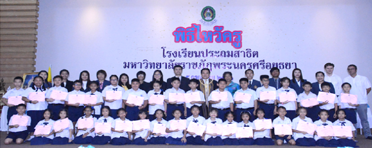 วันพฤหัสบดีที่ 5 กรกฎาคม 2561 โรงเรียนประถมสาธิต จัดกิจกรรมวันไหว้ครู ประจำปีการศึกษา 2561 ณ ห้องประชุมอาคาร 100 ปี มหาวิทยาลัยราชภัฏพระนครศรีอยุธยา ได้รับเกียรติจาก อาจารย์ ดร.เกษม บำรุงเวช อธิการบดี มหาวิทยาลัยราชภัฏพระนครศรีอยุธยา เป็นประธานในพิธีโดยมีนักเรียนเข้าร่วมกิจกรรมจำนวน 423 คน พร้อมด้วยคณะครู บุคลากร นักศึกษา และผู้ปกครองนักเรียน จำนวน 64 คน โดยมีวัตถุประสงค์เพื่อแสดงออกถึงความกตัญญูกตเวทิตาต่อครู อาจารย์ผู้มีพระคุณ และเพื่อสืบสานวัฒนธรรมอันดีงามเป็นแบบอย่างที่ดีแก่สังคมและนักเรียนรุ่นหลังต่อไป