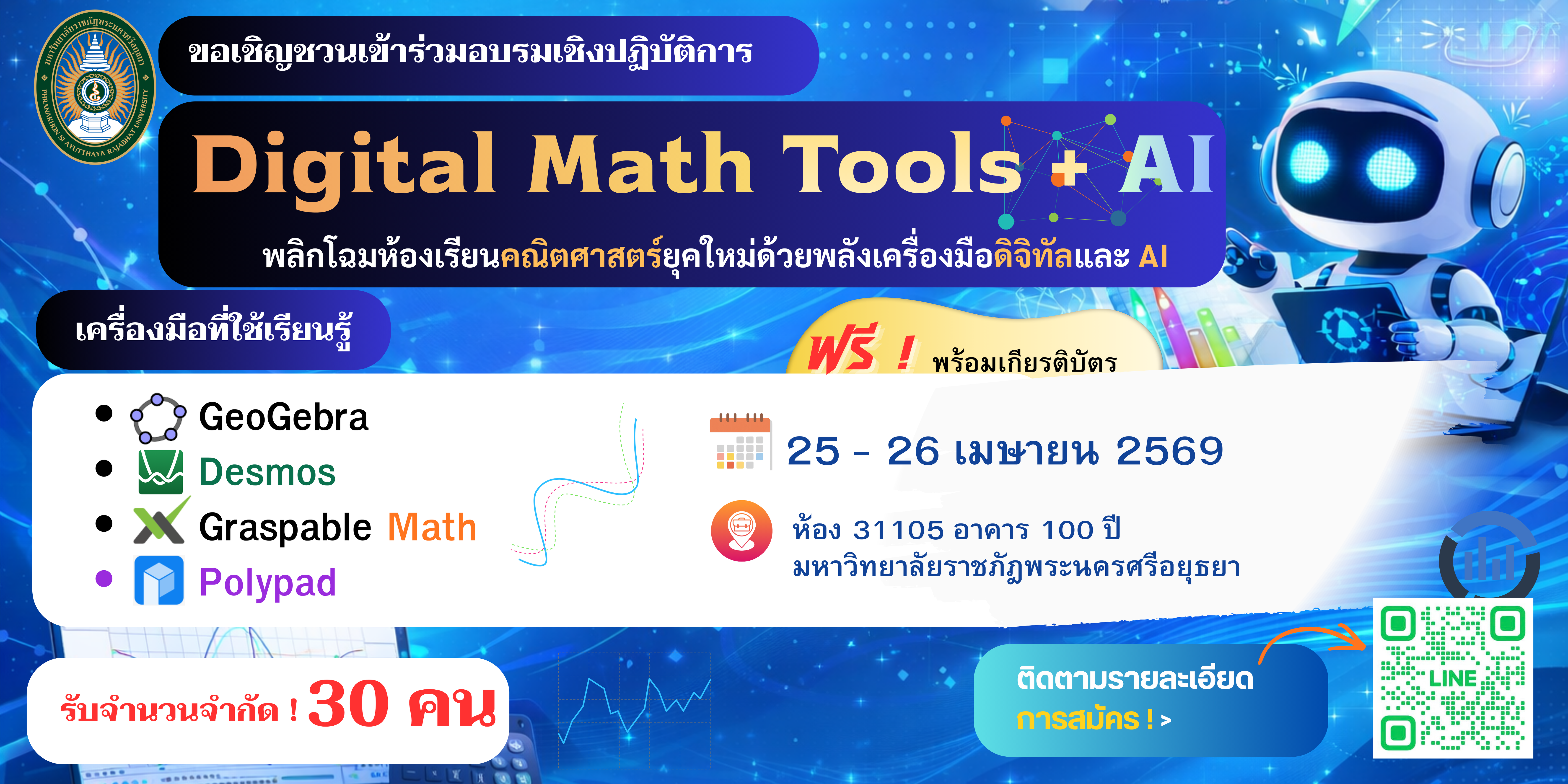 ประกาศรายชื่อผู้ผ่านการคัดเลือกเข้ารับการอบรมโครงการ "วิจัยเพื่อยกระดับการศึกษาวิทยาศาสตร์ คณิตศาสตร์และเทคโนโลยี จังหวัดพระนครศรีอยุธยา มหาวิทยาลัยราชภัฏพระนครศรีอยุธยา ร่วมกับ สสวท. ปีงบประมาณ 2568